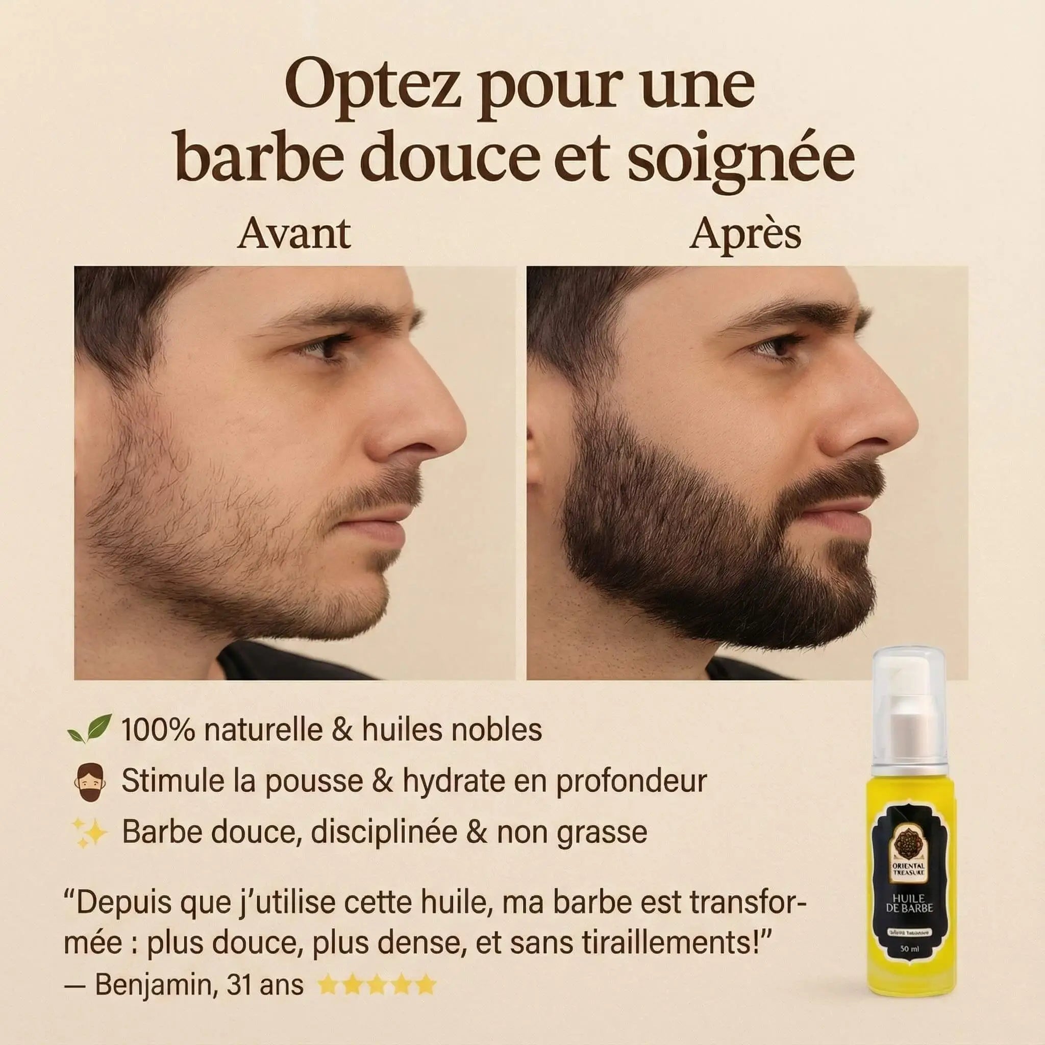 Fördert Wachstum und Stärkung : Mit Rizinus- und Arganöl hilft dieses Öl, die Haare zu stärken und einen dickeren, volleren Bart zu fördern.